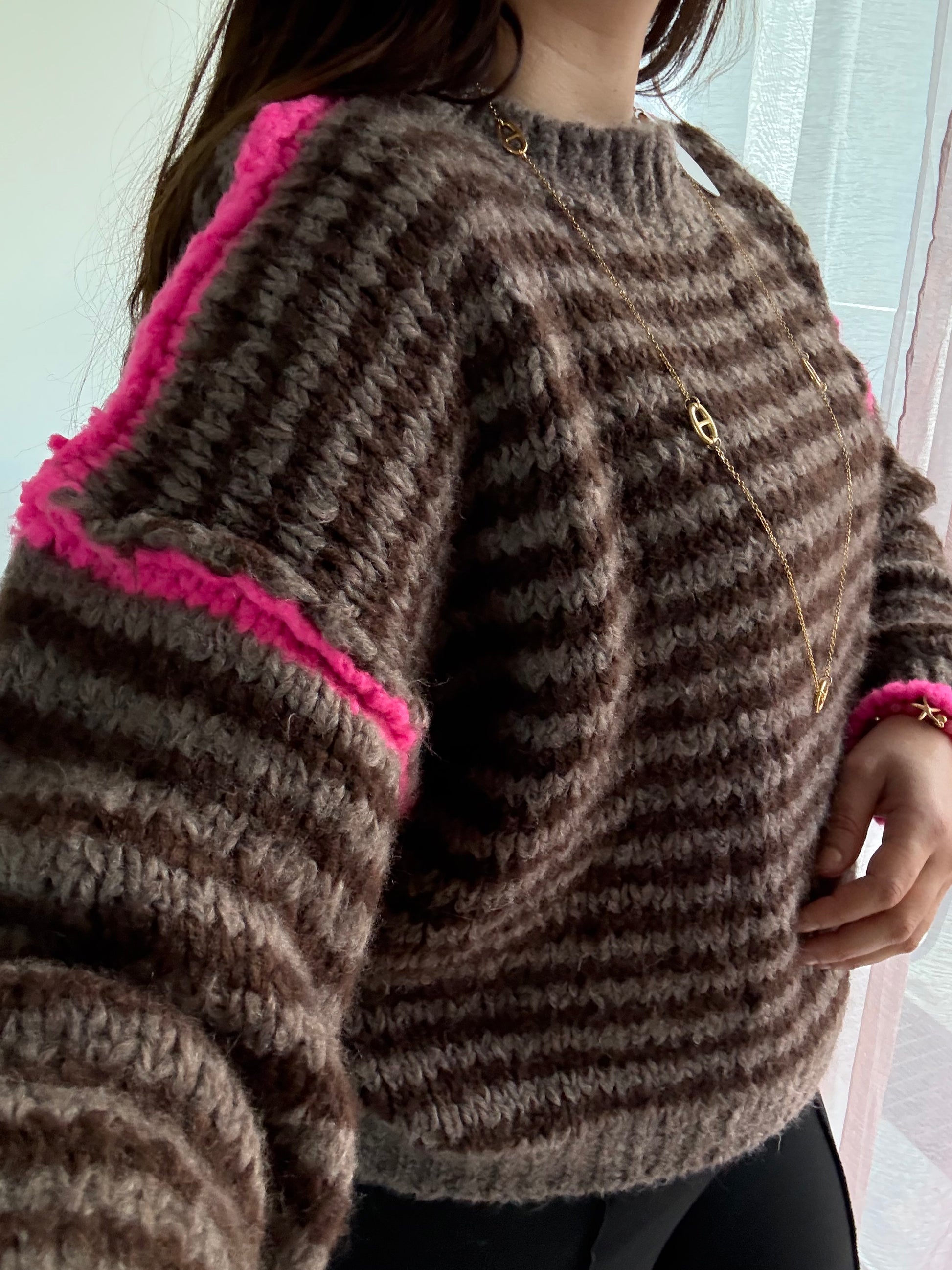 Beau pull tendance choco et fushia avec surpiqûres
